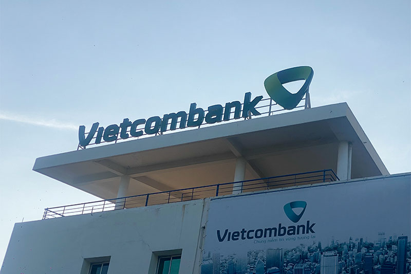 Chất liệu chữ nổi: Bộ chữ được làm bằng nhôm, sơn tĩnh điện, mặt trước được làm bằng tấm Polycarbonate bồi decal 3M, logo in chuẩn màu Vietcombank.